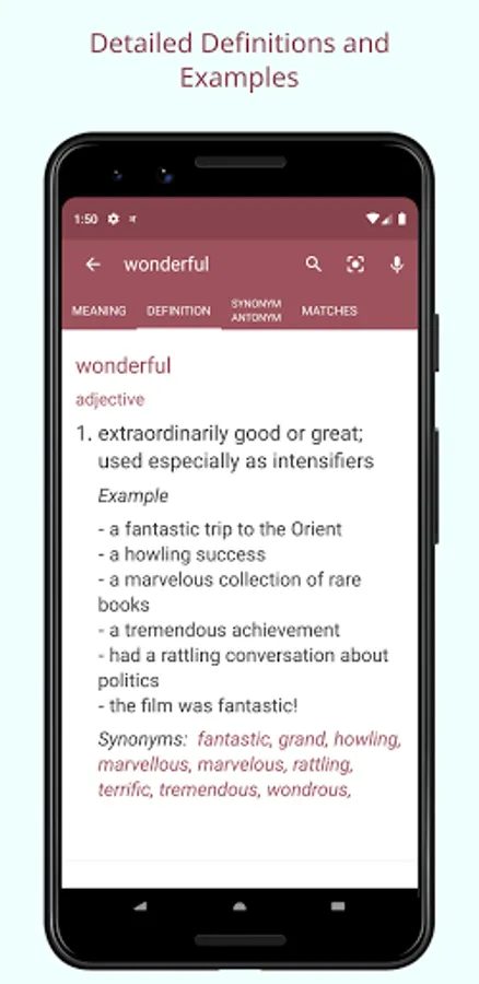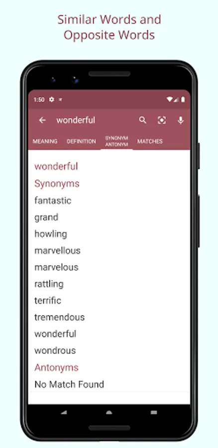 Any tap on the meanings will take you to the reverse lookup any of the meanings. This helps you in understanding more of each word shown by presenting this unique cross-search feature.