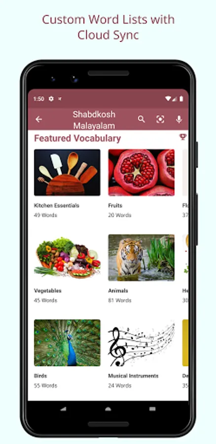 Type the English word and see immediate suggestions from the huge collection of words and get to the meaning quickly by tapping any suggested word in the list. The SHABDKOSH English Malayalam dictionary app shows exact meanings, definitions and short examples along with translations, synonym, antonym and right grammar attributes. You can also choose to listen to the audio pronunciation or see the pronunciation in Malayalam- another unique feature of this app!