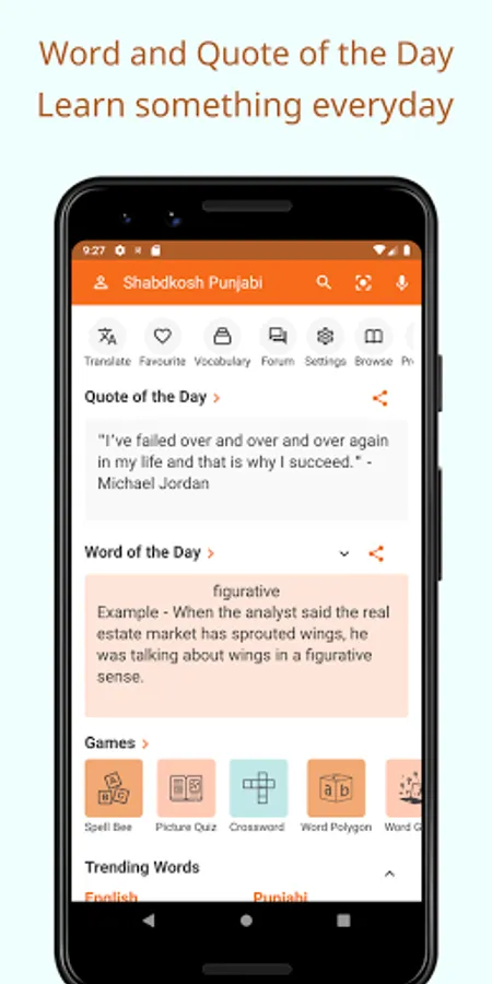 The nifty Word Quiz Game Quiz in English and Punjabi helps you pass time while learning something new! The users of Shabdkosh English Punjabi Offline Dictionary App are very fond of this simple and quick games - which also works without using your data in offline mode.