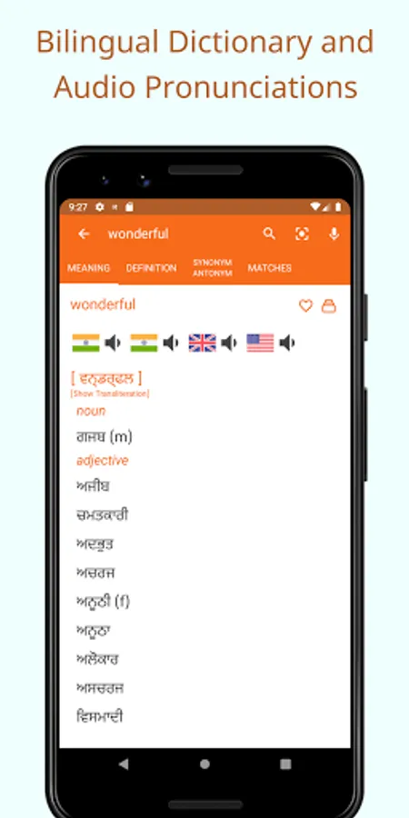 Type the English word and see immediate suggestions from the huge collection of words and get to the meaning quickly by tapping any suggested word in the list. The SHABDKOSH English Punjabi dictionary app shows exact meanings, definitions and short examples along with translations, synonym, antonym and right grammar attributes. You can also choose to listen to the audio pronunciation or see the pronunciation in Punjabi- another unique feature of this app!