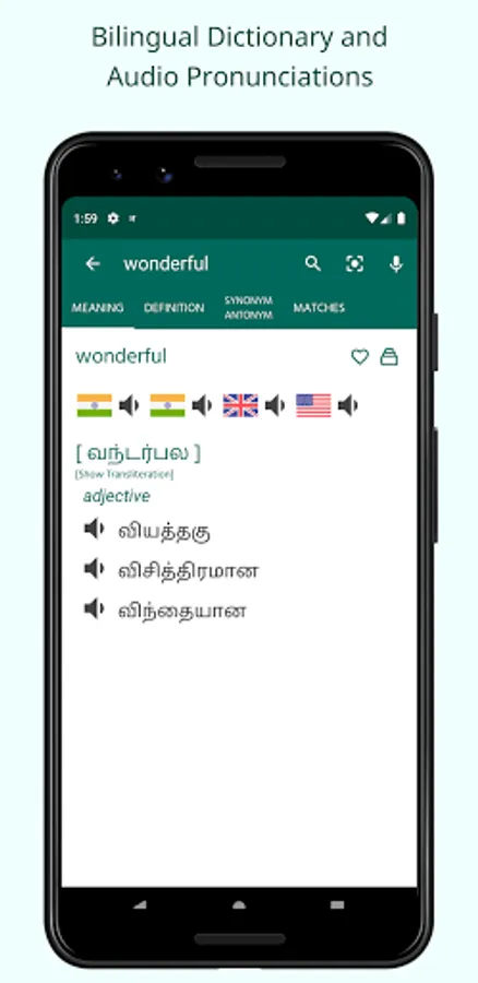 Type the English word and see immediate suggestions from the huge collection of words and get to the meaning quickly by tapping any suggested word in the list. The SHABDKOSH English Tamil dictionary app shows exact meanings, definitions and short examples along with translations, synonym, antonym and right grammar attributes. You can also choose to listen to the audio pronunciation or see the pronunciation in Tamil- another unique feature of this app!