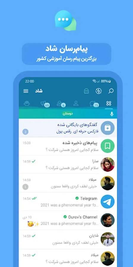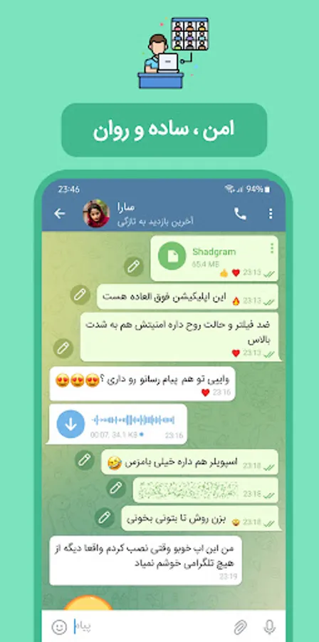 شادگرام یک پیام رسان پیشرفته است که از API های تلگرام استفاده میکند. با این اپلیکیشن میتوانید به دوستان خود در تلگرام پیام ارسال کنید. قابلیت ارسال ویس ، استیکر ، اموجی های متحرک و گیف های غنی در این پیام رسان غیر رسمی گنجانده شده است. امکان ساخت گروه های دوستانه و ایجاد کانال و برقرای تماس صوتی و تماس تصویری را نیز در این اپلیکیشن دارید و می توانید به آسانی و با سرعت بالا و بدون نگرانی از امنیت به فعالیت بپردازید. شاد زیر نظر تلگرام فعالیت کرده و تلگرام همه ارتباط ها را رمزنگاری پیشرفته ای می کند و باعث شده هک شاد غیر ممکن باشد. همچنین شاد گرام می تواند برای شما پروکسی های سالم به صورت خودکار پیدا کند تا بدون نیاز به وقت گذاشتن برای پیدا کردن پروکسی بتوانید از پروکسی های سریع و رایگان استفاده کنید. هم اکنون شاد را نصب کنید و از امکانات پیشرفته ای مثل دانلود منیجر ، زیبا نویس ، تغییر صدا ، پروفایل ساز و غیره بهره مند شوید.