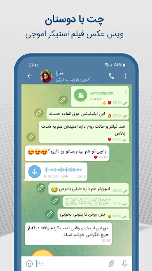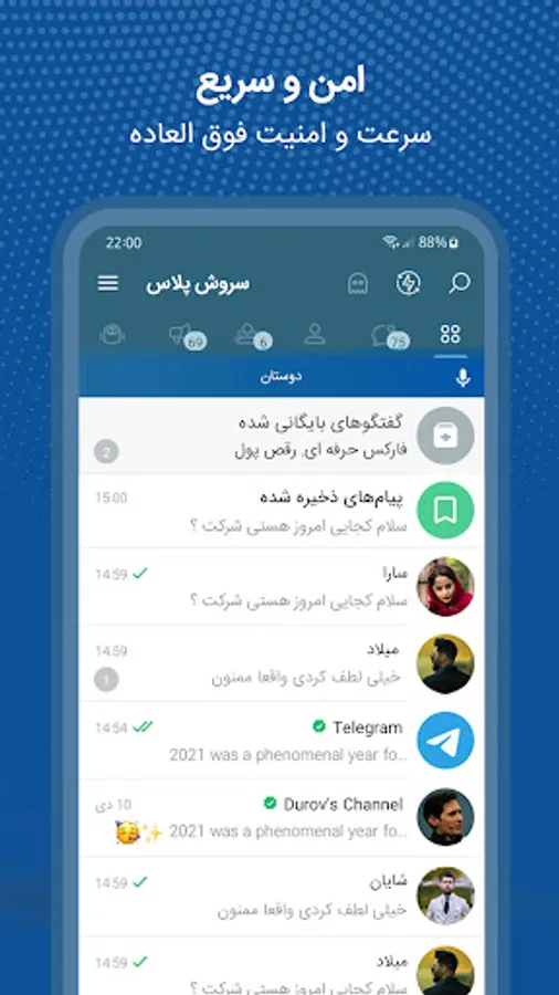سروش پلاس یک پیام رسان و تلگرام غیر رسمی است که می توانید بدون فیلتر شکن به مخاطبین تلگرام خود پیام و عکس ارسال کنید چرا که سروش به صورت خودکار و اتوماتیک می تواند برای شما پر سرعت ترین پروکسی ها را پیدا کند و می توانید به واسطه آن ها به تلگرام متصل شوید. ساختار و چارچوب این پروکسی ها توسط خود تلگرام ارائه شده و امنیت کامل دارد. تلگرام اصلی همه پیام ها و اطلاعات شخصی کاربران را رمزنگاری می کند و همه ارتباطات توسط رمزنگاری ایمن شده اند و امکان هک سروش نیست. این برنامه از API های تلگرام استفاده میکند مانند تلگرام ایکس ، تلگرام پلاس ، گراف مسنجر ، تلگرام طلایی ، موبوگرام ، ایتا و روبیکا. با استفاده از این اپلیکشن می توانید تماس صوتی و تماس تصویری رایگان داشته باشید و به راحتی پیام ارسال و دریافت کنید و هر نوع فایلی از جمله عکس و فیلم و ویس به دوستان خود ارسال کنید. دانلود منیجر پیشرفته ، تغییرات مخاطبین ، تلگرام با حالت روح ، زیبانویس ، تغییر صدا ، فوروارد با ویرایش پیشرفته ، فوروارد بدون نقل قول و با نقل قول ، استوری ، اموجی متحرک ، استیکر ، بیوگرافی ، چت های مخفی ، پوشه بندی ، منشی خودکار ، مخاطبین خاص و اعلان انلاین شدن مخاطبین خاص ، تغییر فونت کل برنامه ، فایل منیجر ، پروکسی خودکار و غیره از قابلیت های این تلگرام غیر رسمی پیشرفته یعنی سروش گرام می باشند. منتظر چی هستی همین الان این پیام رسان رو نصب کن تا بتونی با دوستات چت کنی و تماس صوتی و تصویری برقرار کنی و در گروه های خانوادگی و کانال ها و شبکه های اجتماعی فعال بشی و بتونی اموجی و استیکرهای خاص رو در چت هات استفاده کنی. با این اپلیکیشن به راحتی استوری بزار و قشنگ ترین لحظاتت رو با دوستانت اشتراک گذاری کن.
