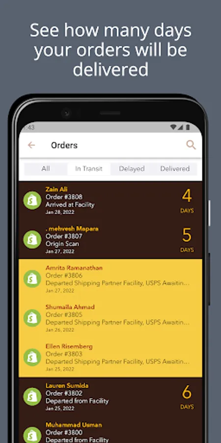 Ordr is an easy way for sellers to keep tracking of where packages they've sent out are. It shows how many days left until the package will be delivered at a glance on the main screen.