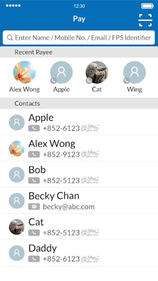 - Transfer funds by using payee’s mobile number or email address without entering the receiving bank account information. You can also scan QR code to pay.