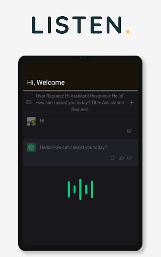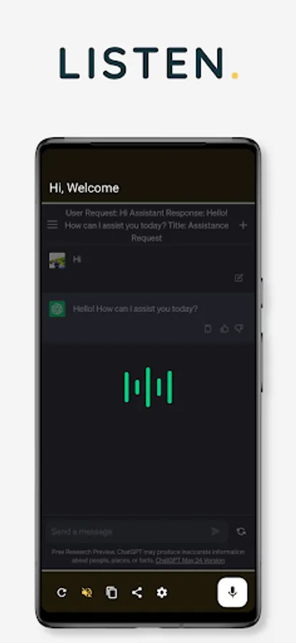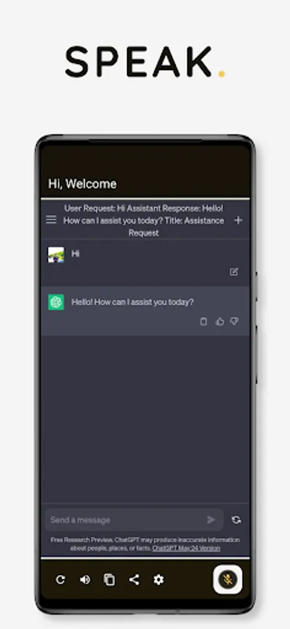 Speak into your device's microphone to input commands, and let our app do the rest. Our app will process your command, and provide a response from ChatGPT. But the magic doesn't stop there. The app will automatically speak out the response, giving you a truly hands-free AI experience.
