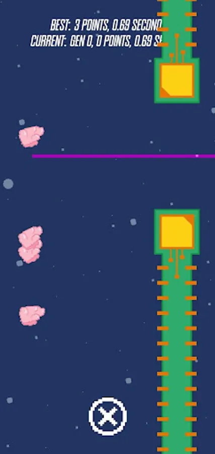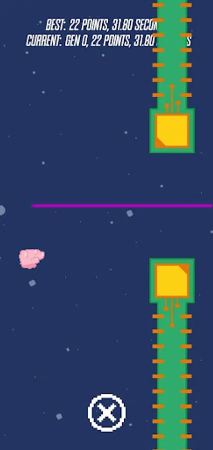 You can play this flappy clone by tapping the screen and having the big brain jump over the chips, but you can also let the AI learn how to play and watch its progress!