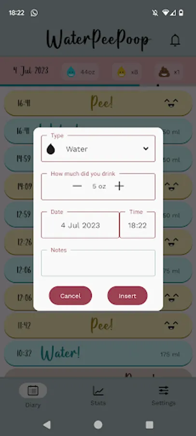 With WaterPeePoop, you can effortlessly track how much water you drink and keep a record of your visits to the bathroom. Our intuitive diary feature displays the past 7 days, providing a clear overview of your hydration progress and bathroom frequency. 🗓️💧 The real-time progress bar keeps you motivated by showing how much water you've consumed and the target amount you should aim for each day. 📊🚽