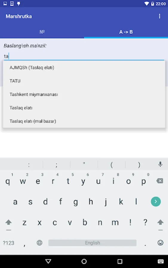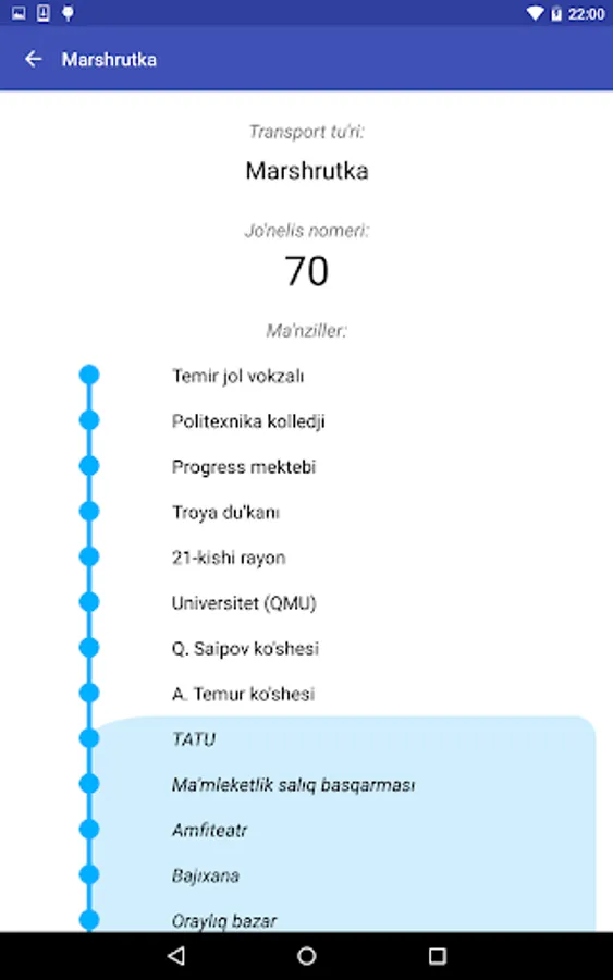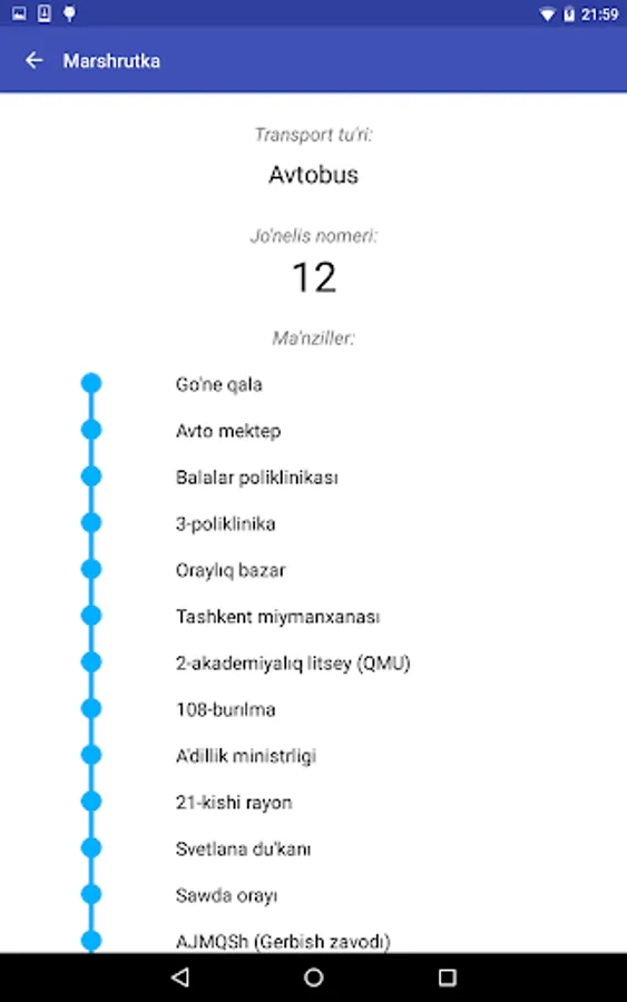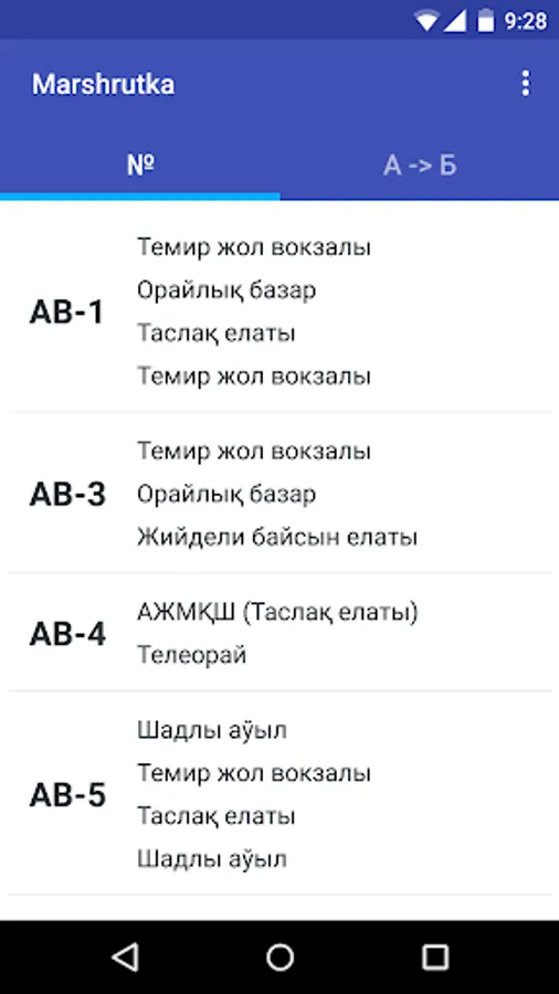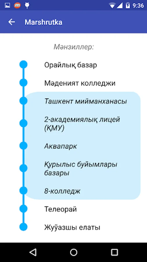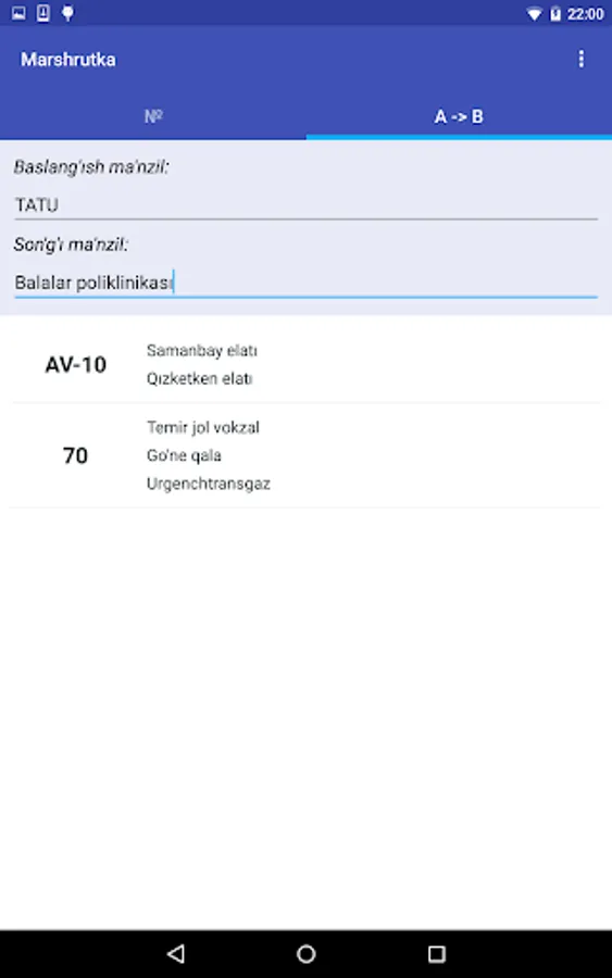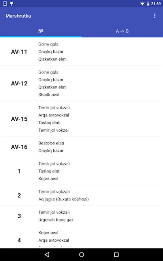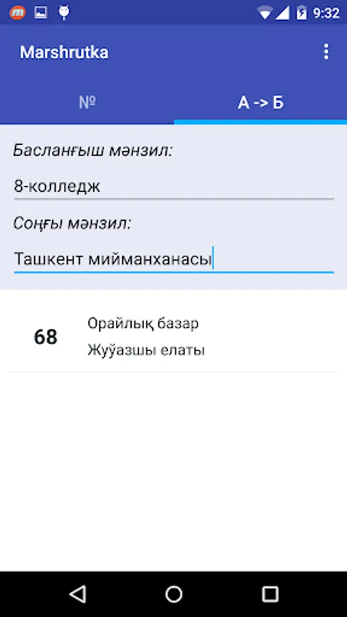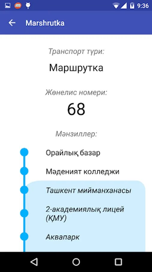 - Пайдаланыўшы тәрепинен басланғыш ҳәмде соңғы мәнзиллер берилген ҳалда, сол еки мәнзилден жүретуғын маршрутка ҳәм автобуслар дизимин көриў