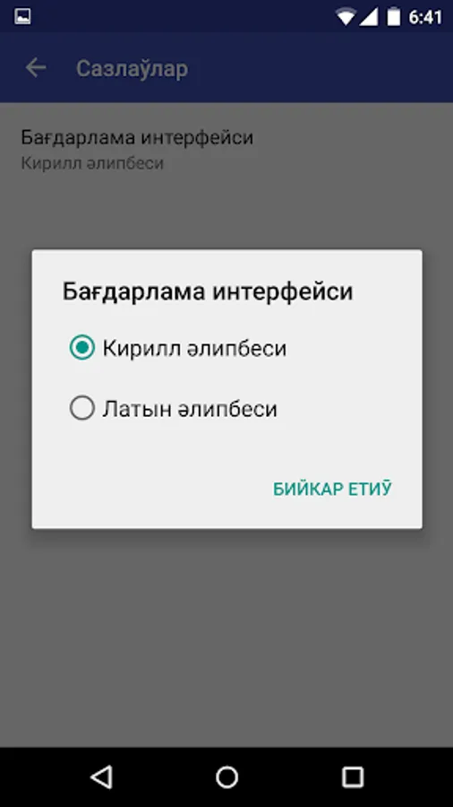 - Бағдарлама интерфейси ушын латын яки кирилл әлипбелерин сайлаӯ