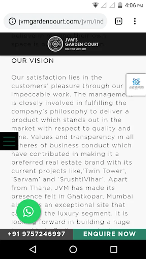 JVM Spaces believes in building spaces in terms of building homes with security that gives satisfaction financially and emotionally. JVM Spaces is one of the upcoming leaders in its market segments by providing the highest level of consumer satisfaction. Confidence building through providing the best of homes which enhances the value of the people who believe in making their own space is our main ambition.