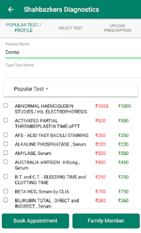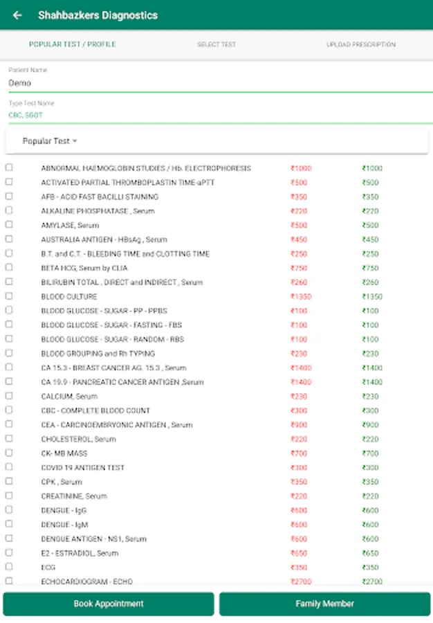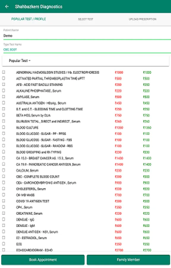 1. Book your tests by writing the test name or by selection from popular tests and profiles or by uploading a doctor's prescription.