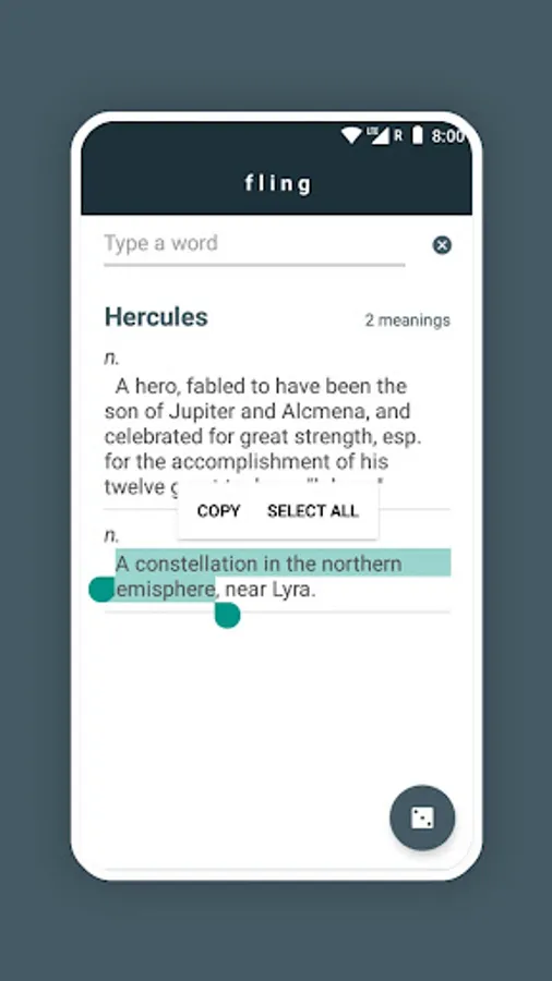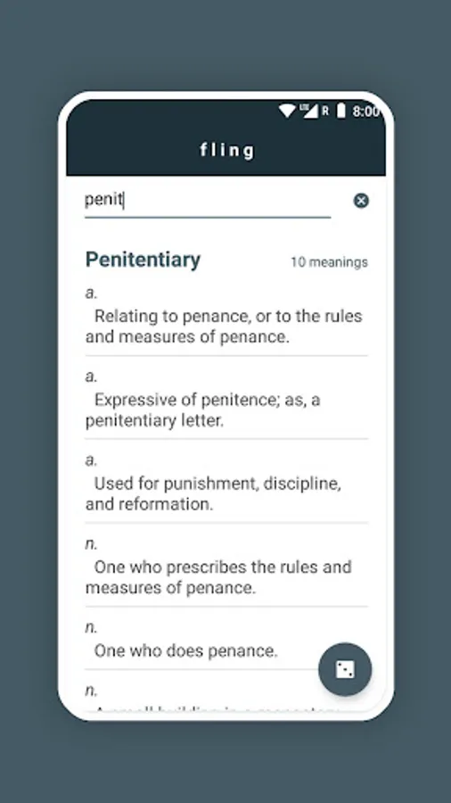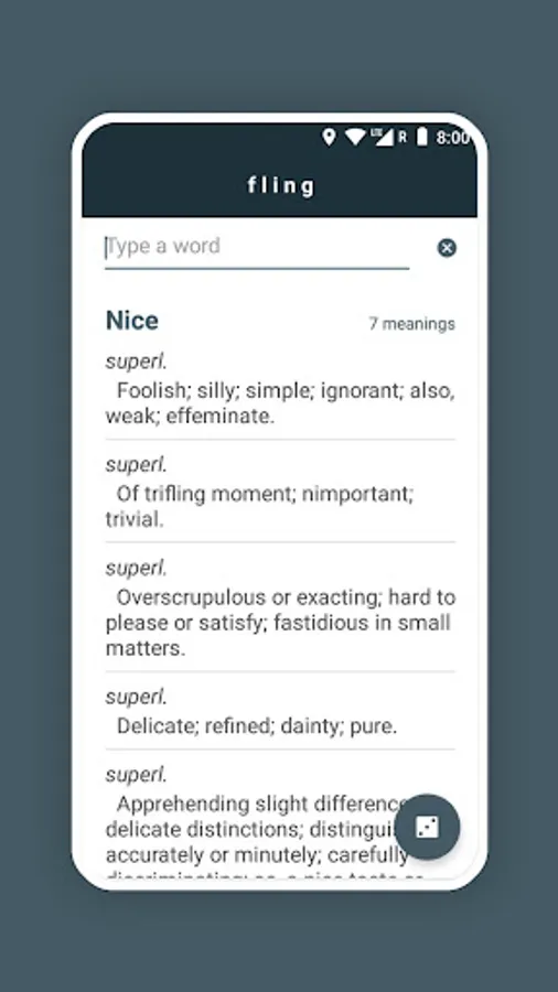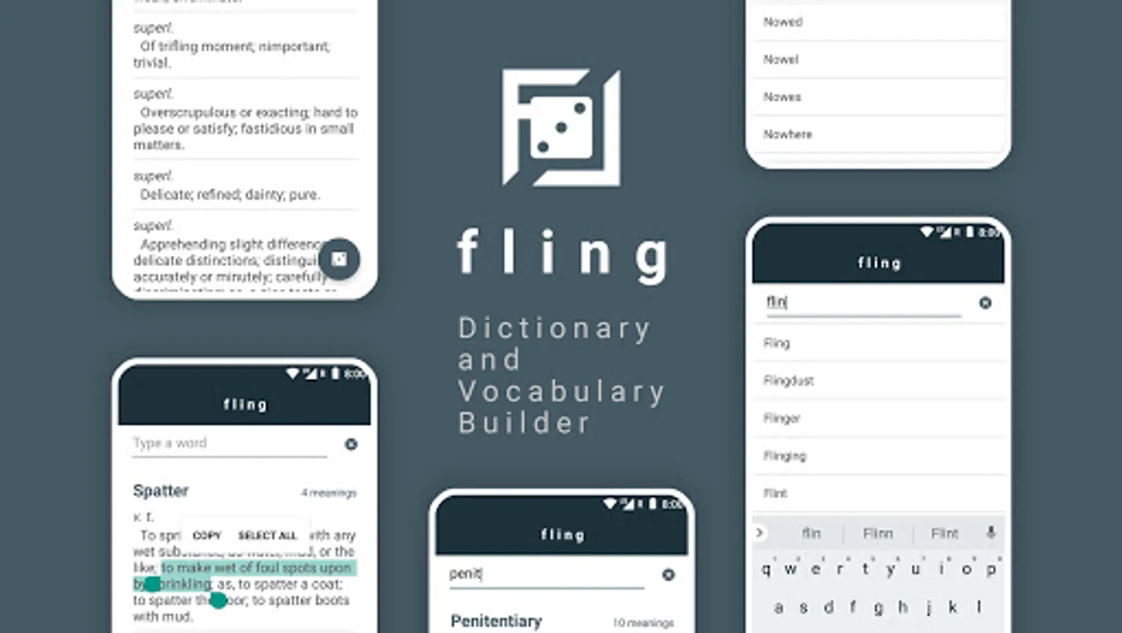 Fling is a dictionary and vocabulary building app for everyone. Fling contains more than 156K words and its meanings.