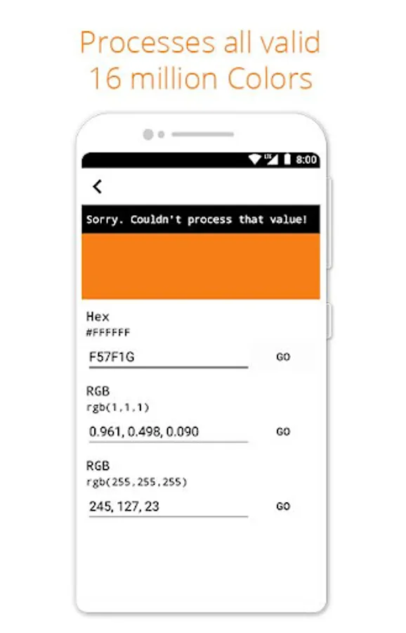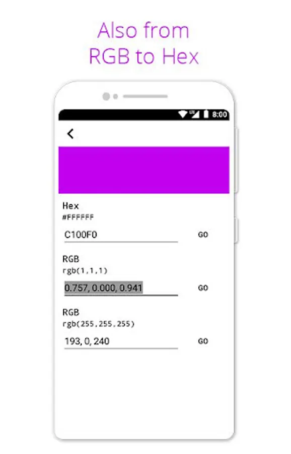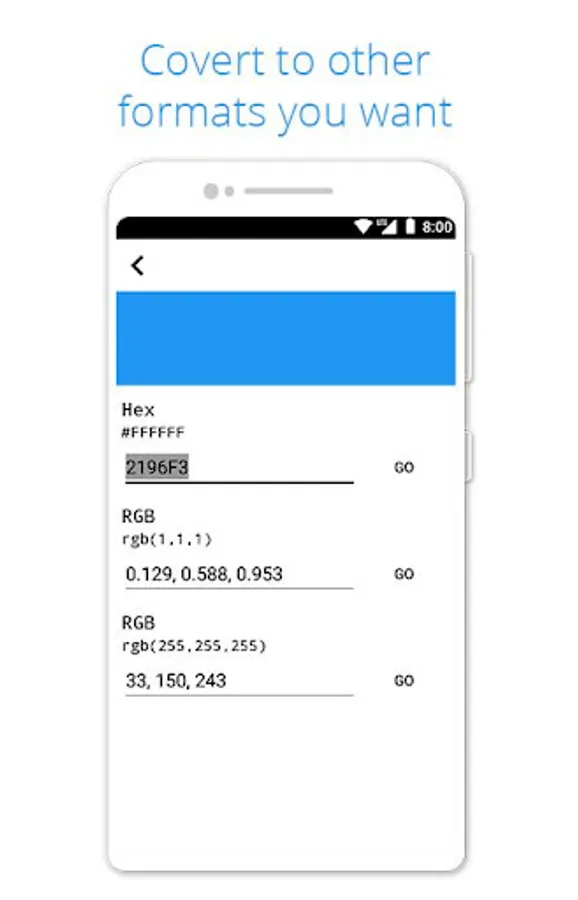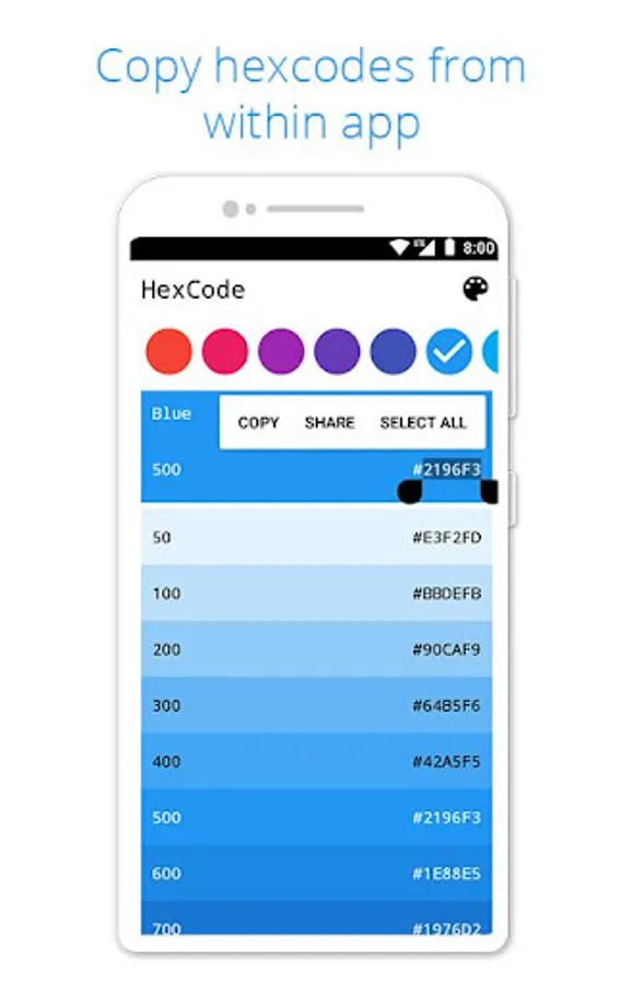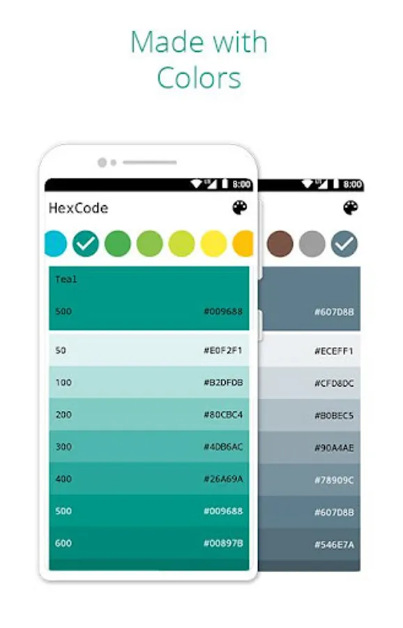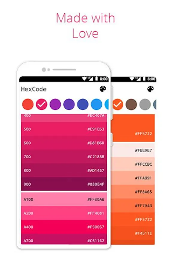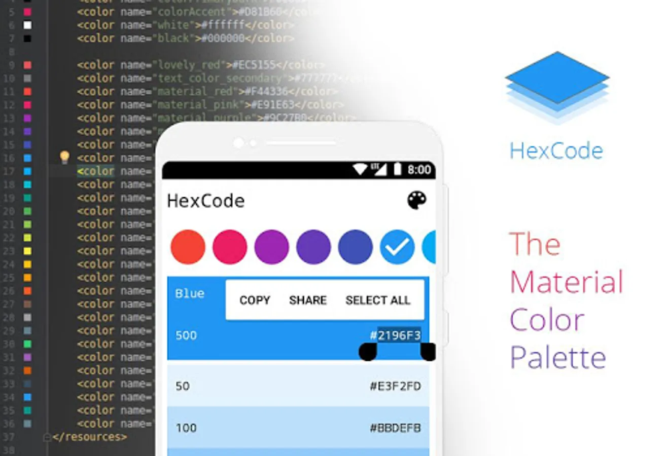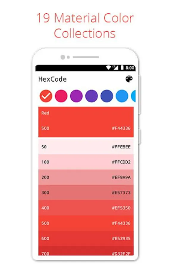 HexCode is a collection of all 19 google material colors, along with color converter. You can copy the color hex value and use it directly in projects, or if required can even convert it to rgb(1) or rgb(255) format. With HexCode, you can even search all possible 16 million color values. Can convert hex to rgb and rgb to hex.
