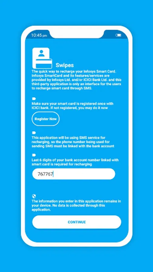 - Infosys smartcard and its offerings are properties of Infosys Ltd. and/or ICICI Bank Ltd. This application is only an interface which simplifies the tasks for the end user, and not an official application.
