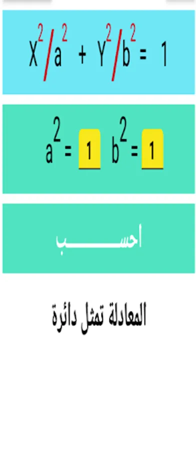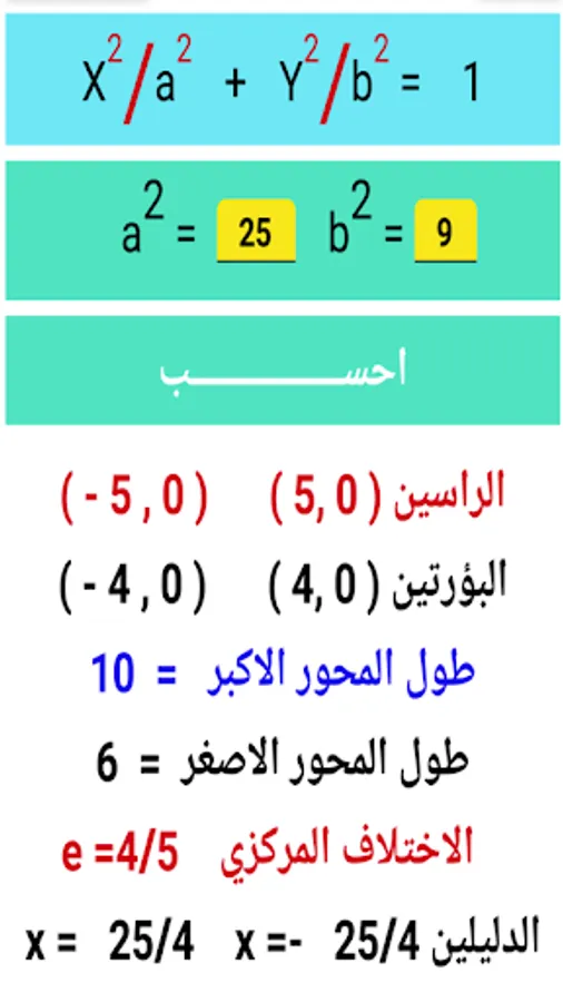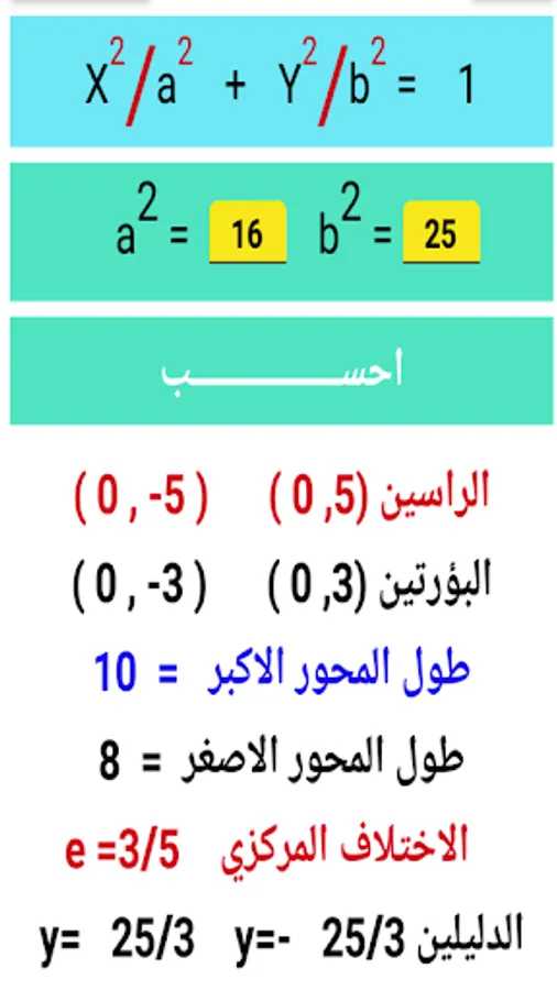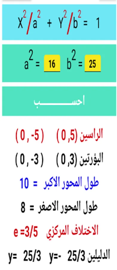 The application calculates the two foci and the two headers, the length of the larger and smaller axes, calculates the central difference, and calculates the two index equations by just entering the equation