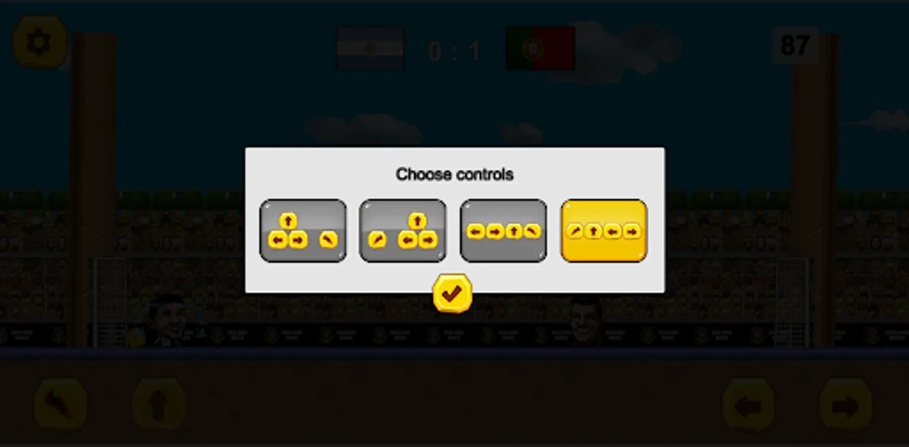 There are 4 different controls layouts that you can choose to display on your screen. Each layout has been designed to facilitate the users based on whether they are left hand sided or right hand sided. Select the control layout that best suits your playstyle and jump into the action of Headball Puppet Soccer.