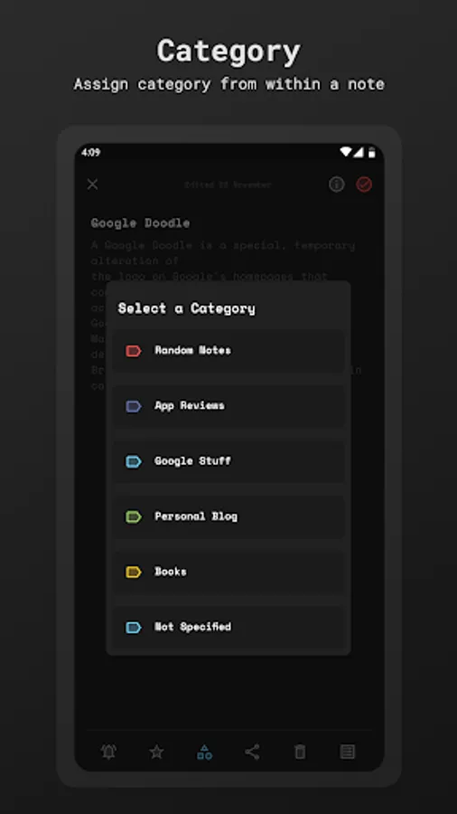 Scrittor helps with a simple and easy to use interface. There are not extra unnecessary features to make everything super complex. You add notes, select a category and you are done. App primarily focuses on storing notes categorically and keeping interface as simple as possible.