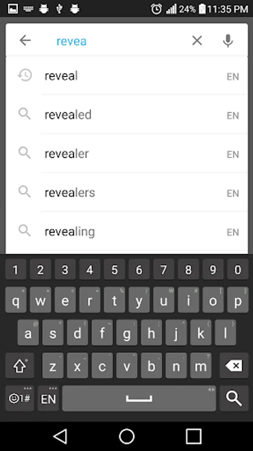 When you type word in the app automatic word search performed on indexed dictionary database and prefix matched word list are instantly appears. No need to hit or wait to see search result.