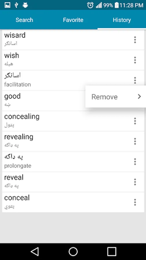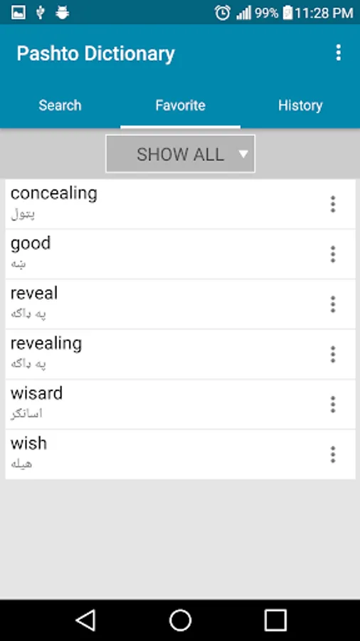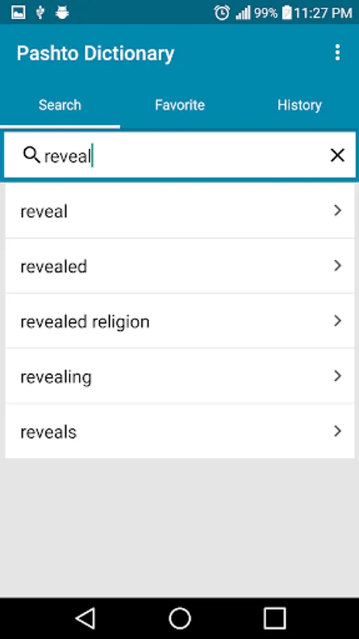 Pashto and English word search within this dictionary is very fast so it shows prefix matched words instantly.