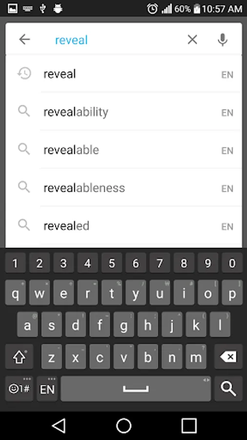 When you type word in the app automatic word search performed on indexed dictionary database and prefix matched word list are instantly appears. No need to hit or wait to see search result.