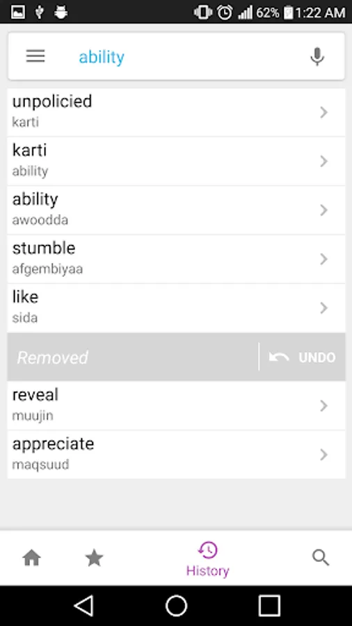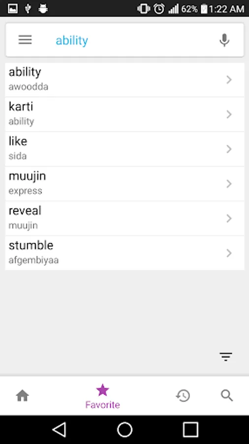 Somali and English word search within this dictionary is very fast so it shows prefix matched words instantly as you type.