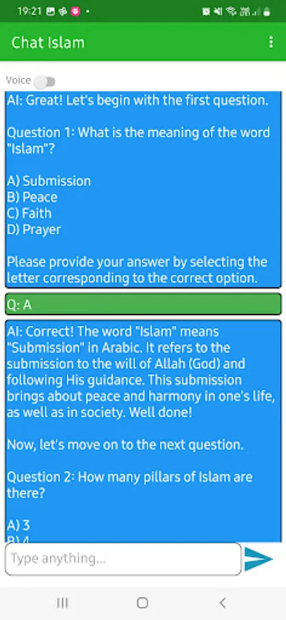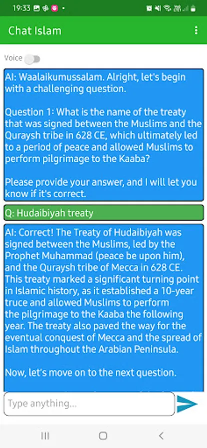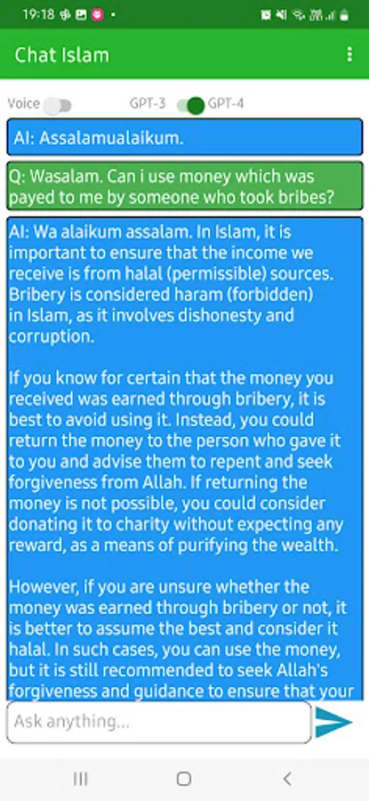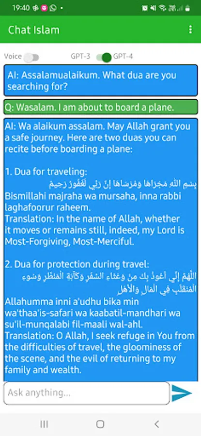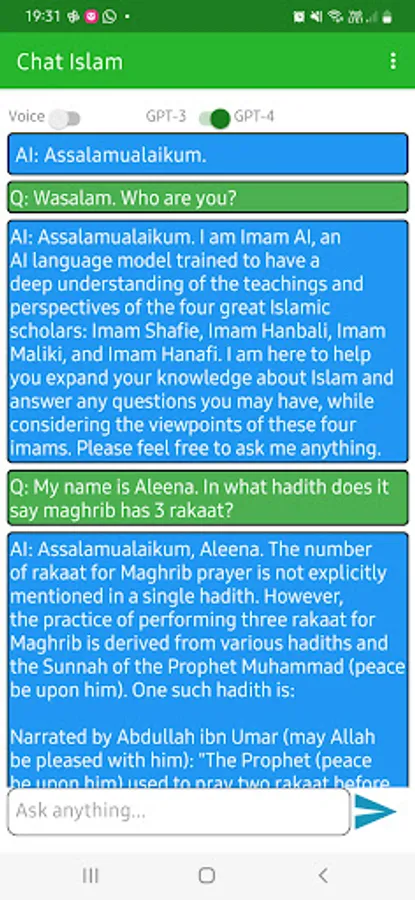 Chat Islam is an app that utilizes artificial intelligence (AI) to generate responses to user inquiries based on Quranic and Sunnah sources. Please note that the answers provided by the app are solely derived from Islamic texts and do not represent the opinions or beliefs of the developer or any other individual or organization. The app is designed for informational purposes only and should not be used as a substitute for seeking guidance from qualified religious scholars or experts. The developer assumes no responsibility for the accuracy, completeness, or usefulness of the information provided by the app. Users are advised to exercise their own discretion when using the app and to verify any information obtained through it with additional sources. By using this app, you acknowledge and accept these terms and conditions.