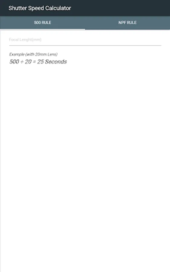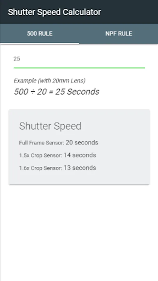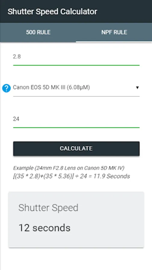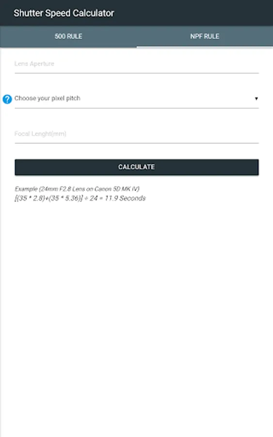 Shutter speed calculator uses the “500 rule” and “NPF rule” to help you to calculate the maximum shutter speed.