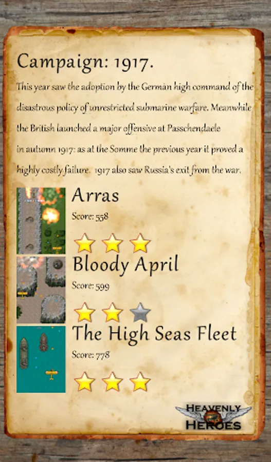 You begin this game as an Allied pilot in 1916. Germans just unleashed their famous 'Fokker E' planes upon your comrades. Can you stop the onslaught? Can you tip the balance to your side? Can you become a true Heavenly Hero?