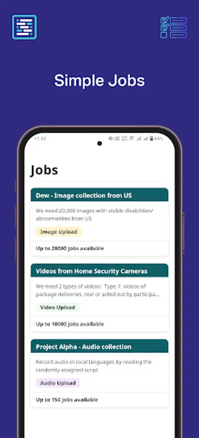 Select a job you like & work on tasks by collecting pictures, audio, or video using the app.
