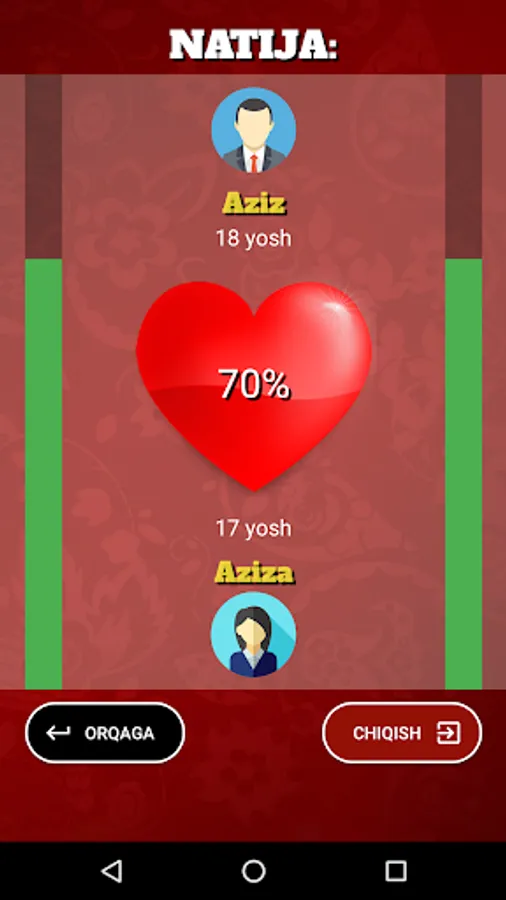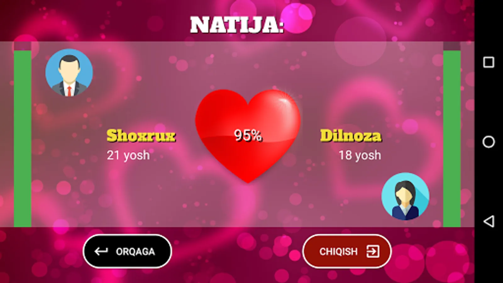 Sevgi Testi ilovasi sizga qadimgi raqamli algoritmdan foydalangan holda siz va sevganingiz o'rtasidagi muvofiqlik foizini darhol aniqlashga yordam beradi. Ism va yoshni kiritgan holda odamlar orasida qanday kuchli sevgi bo'lishi mumkinligini bilib olasiz.