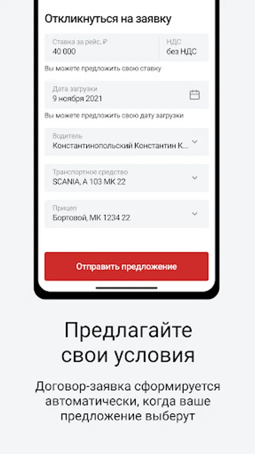 Add drivers and cars, offer your conditions and price on request. The application contract will be generated automatically when your offer is selected.