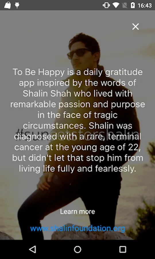 To Be Happy is a daily gratitude app inspired by the words of Shalin Shah who lived with remarkable passion and purpose in the face of tragic circumstances. Shalin was diagnosed with a rare, terminal cancer at the young age of 22, but didn't let that stop him from living life fully and fearlessly.
