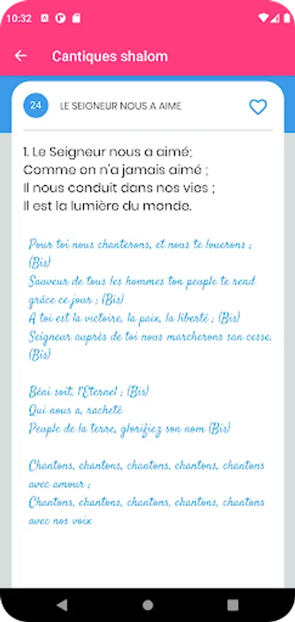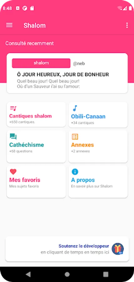 The SHALOM hymns application allows users to sing the 396 BULU hymns in French (the numbering being respected). It also contains more than 280 hymns from the SAF, ATG, BAFIA and BASSA collections. In addition, the application integrates the songs of the choir of mature men (Obili-Canaan Parish), the catechism, the liturgy of worship (EPC), the confession of Christian Faith, the Sunday prayer and the themes of hymns. Finally, note that the ergonomics of the application takes into account users of all age groups.