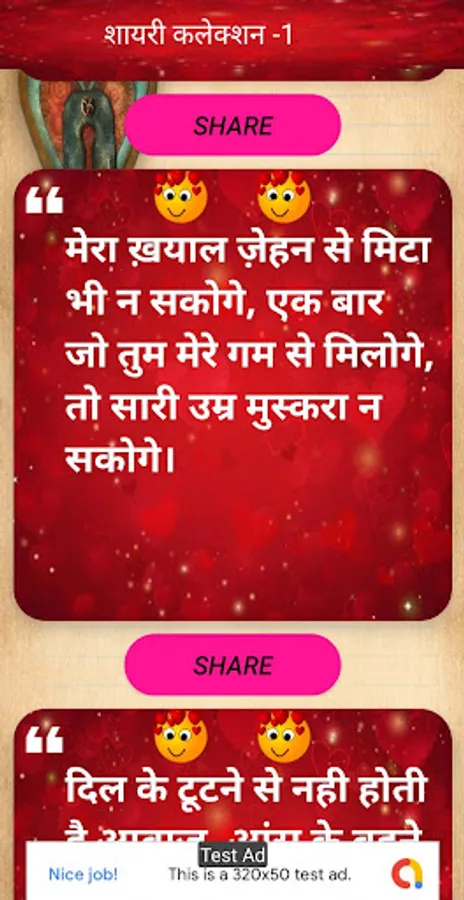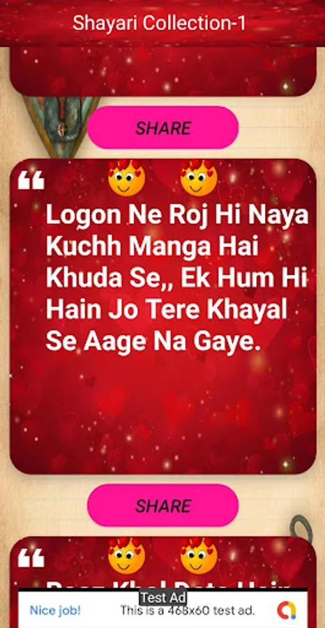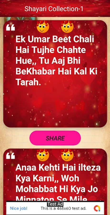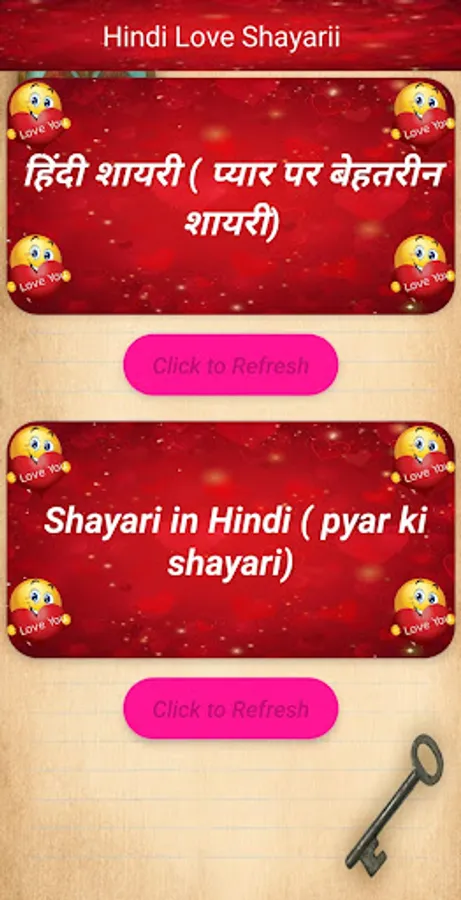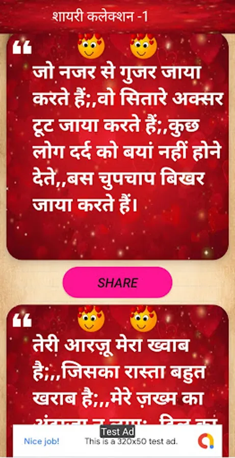 This app has 100's of free shayari to view and share to your friends and family. It has amazing layout that express love and emotion.It is a unique app as it is different from other app on play store.