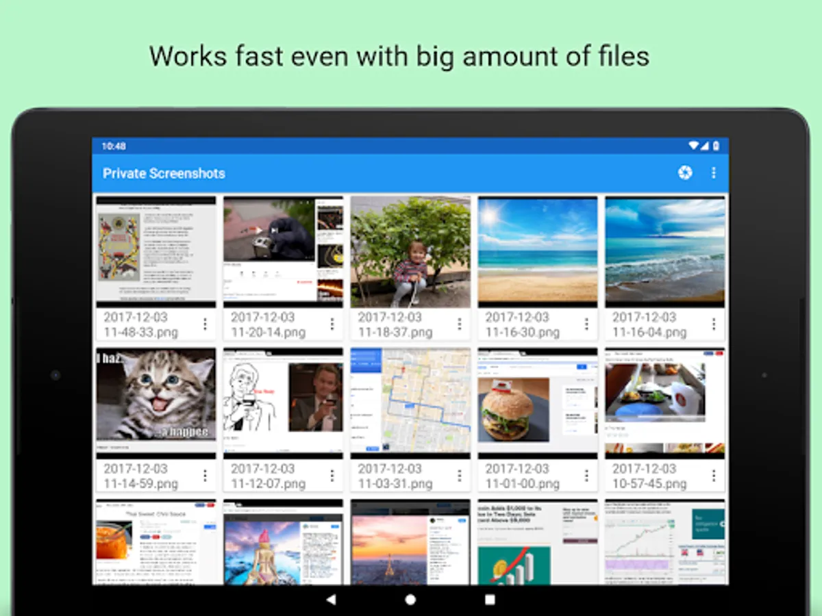 All files are saved into hidden directory. The app doesn't broadcast any message about new screenshot. Any other app can't access screenshots directly. Only you can browse them, share or delete.