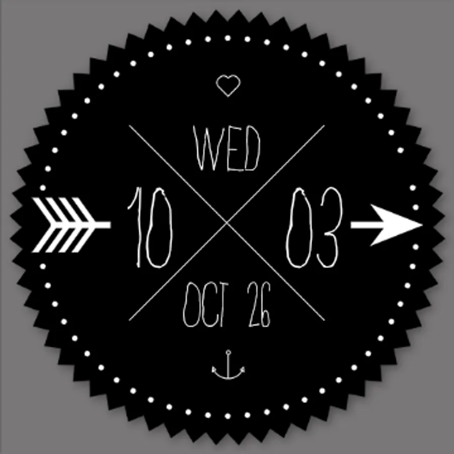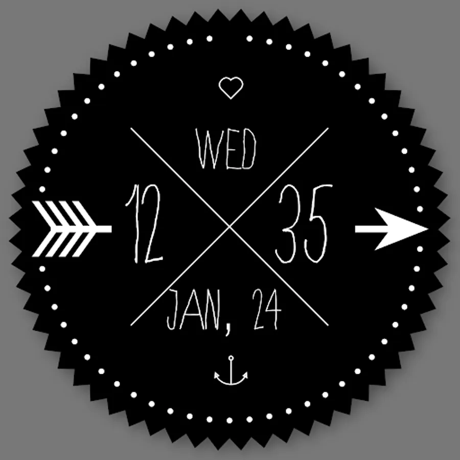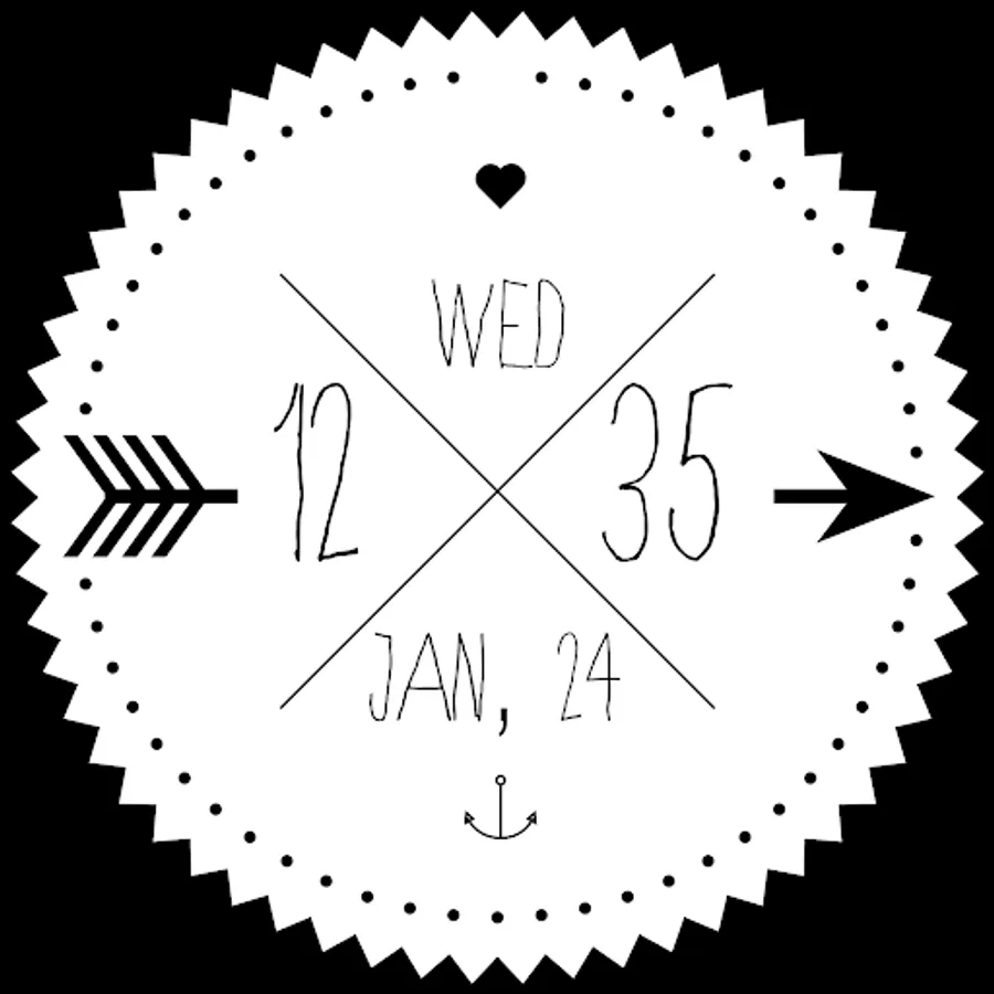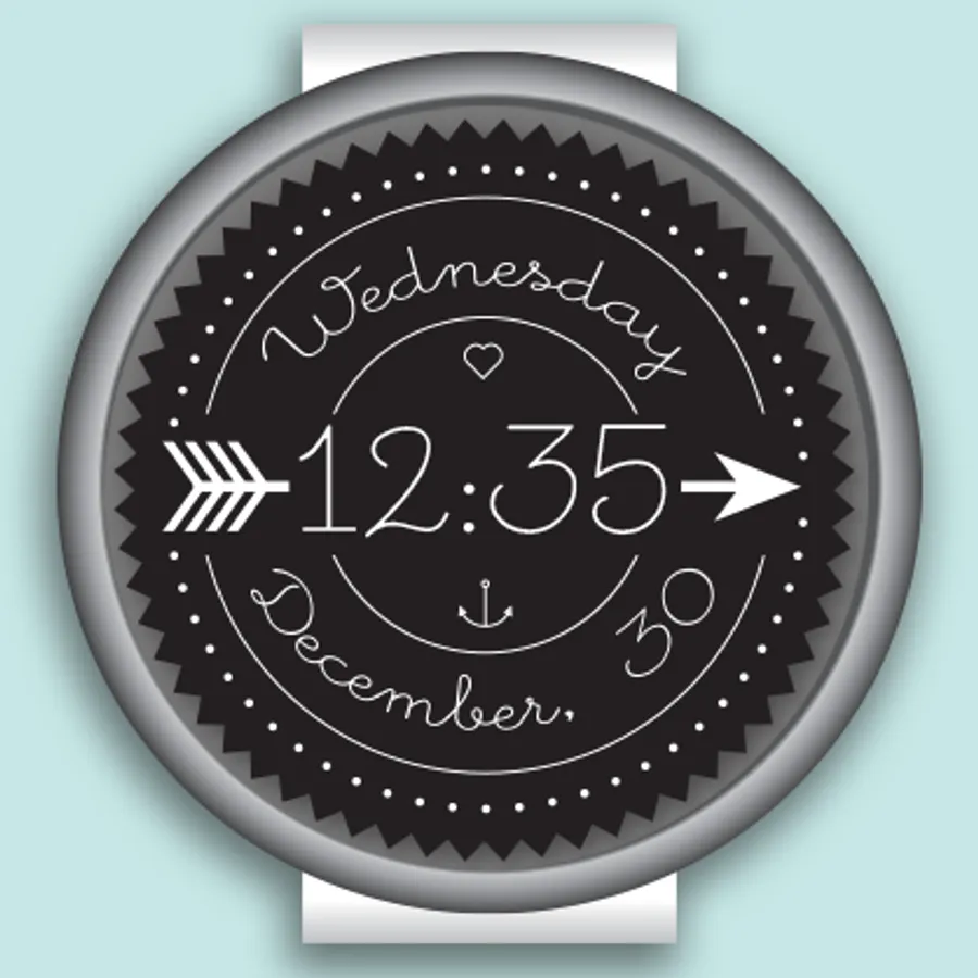 This beautiful watch face features the time, date and day artfully displayed for any android wear device. Show off your creative side with this unique clock. A ring of dots indicate the seconds while the hours and minutes are written out digitally.