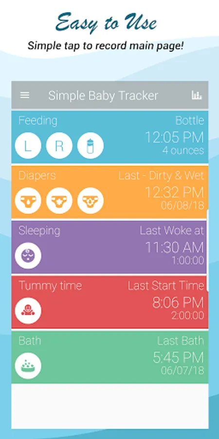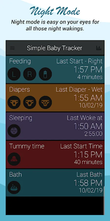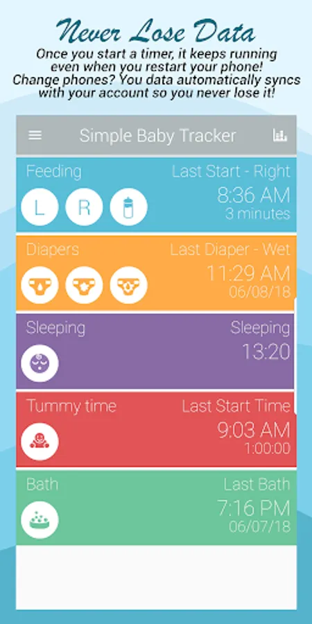This app quickly and easily tracks all relevant information and displays it in the most efficient format. Feedings are tracked from the time they start, so we show the last start time and breast side used or bottle amount fed. Naps are best tracked by when the baby last woke up so you know when you need to put them down for another nap. We also show the last diaper, bath and tummy time with more options coming soon!