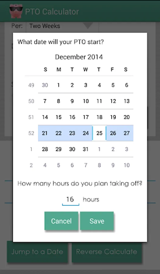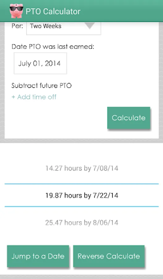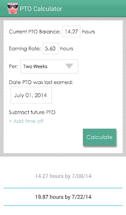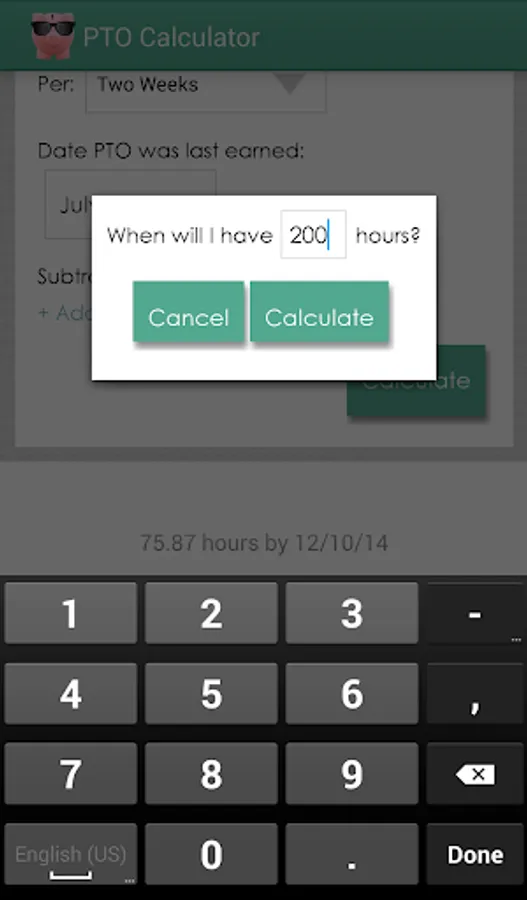This calculator uses your balance and earning rate to determine how much PTO you will have on a future date or when you will have a specific amount of PTO. Not sure if you'll have enough time off to take that vacation you want? This app can tell you!