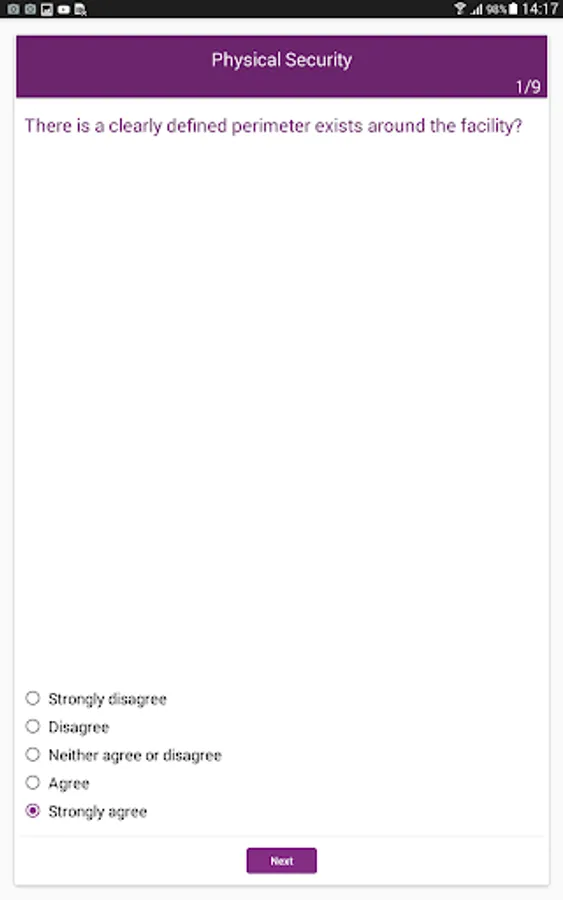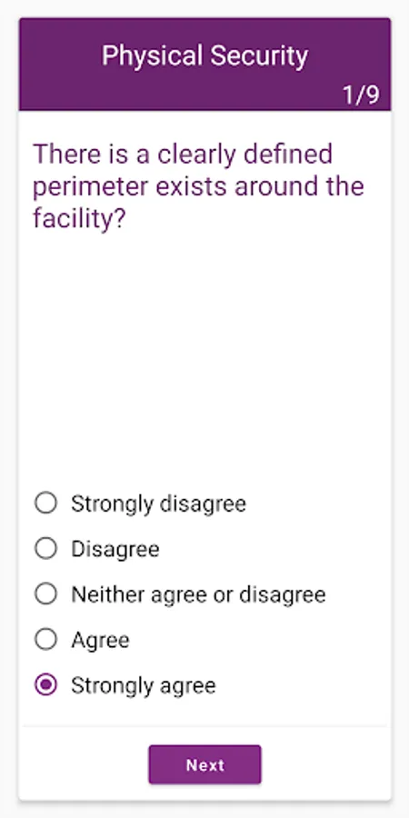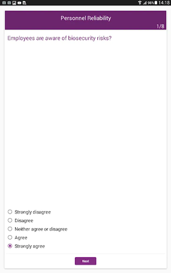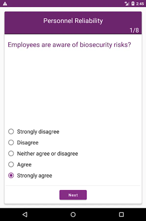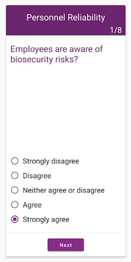 This application is an electronic comprehensive questionnaire composed of multiple choice questions outlines the five elements of the biosecurity system: physical security, personnel reliability, material count and accountability, information security, and transport security. Each section of this questionnaire contains few specific questions cover one of the biosecurity elements. The application takes the numeric value of each answer and store it in a backup system to be used in the final assessment.