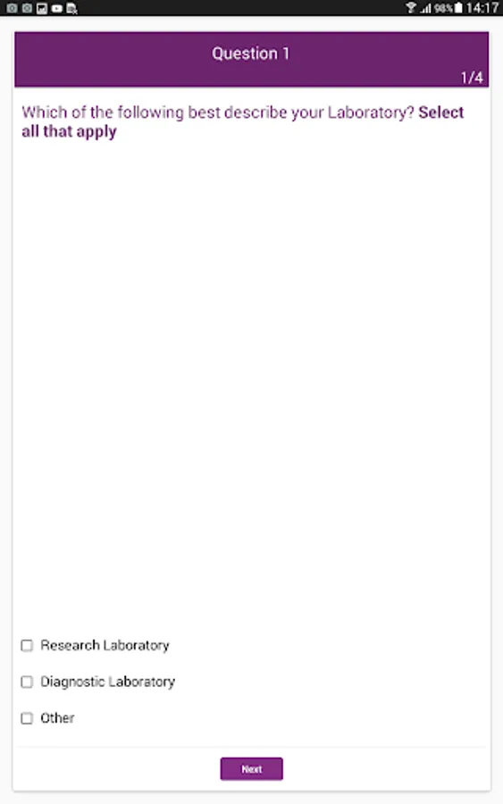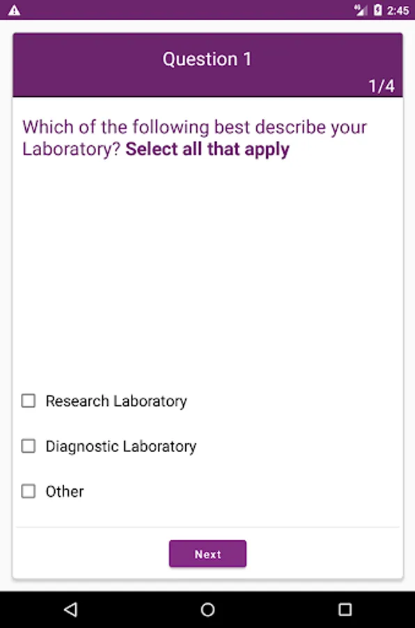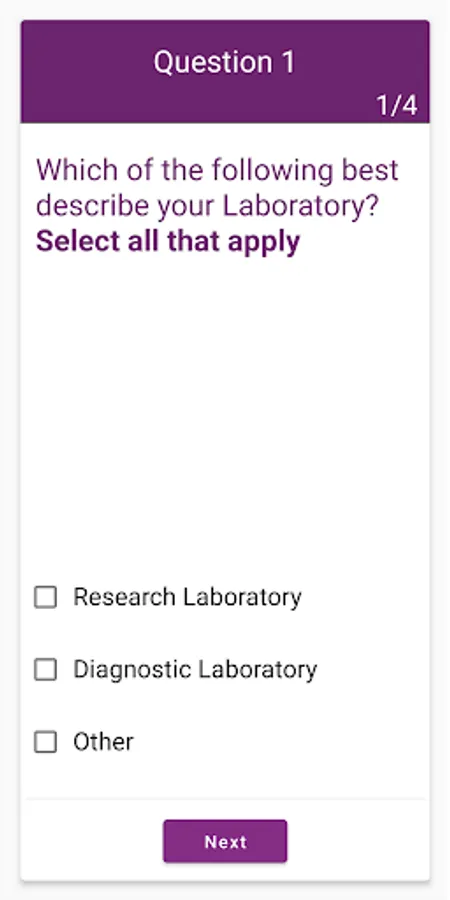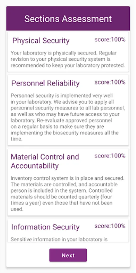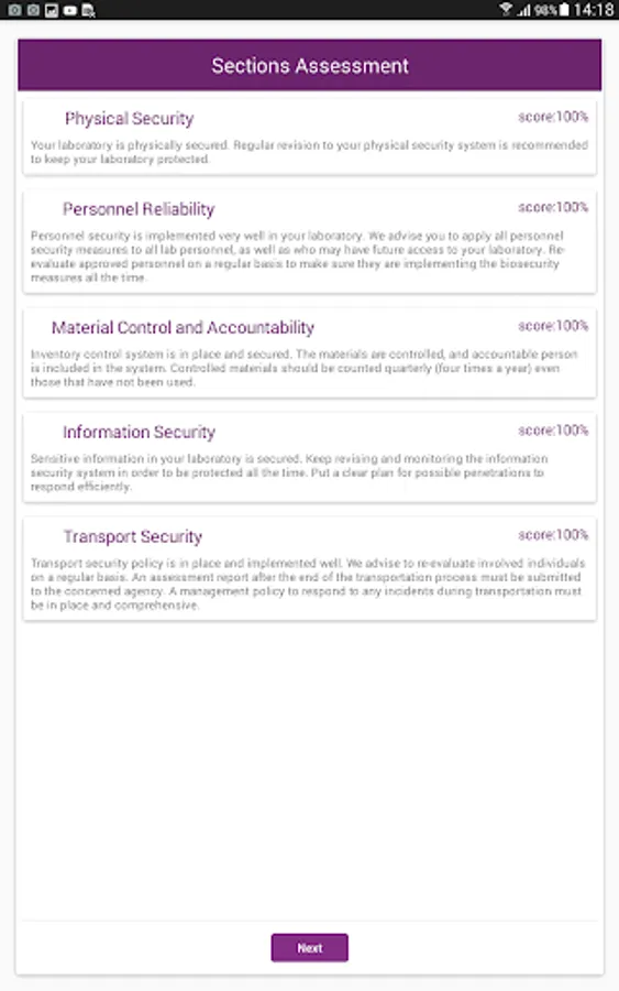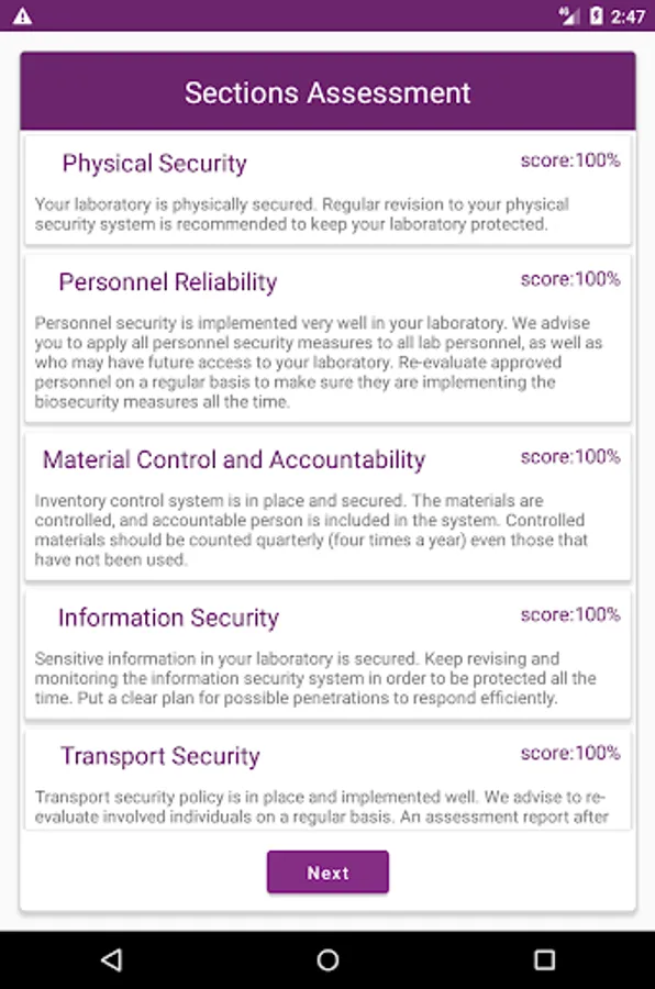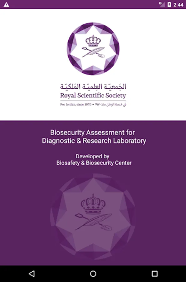 The “Biosecurity Questionnaire” is an application developed by the Biosafety and Biosafety Centre at Royal Scientific Society (Amman-Jordan) in 2019. The main purpose from developing this application is to create a fast, easy to use, modern, and efficient tool for assessment the biosecurity system for any research and diagnostic laboratory all over the world.