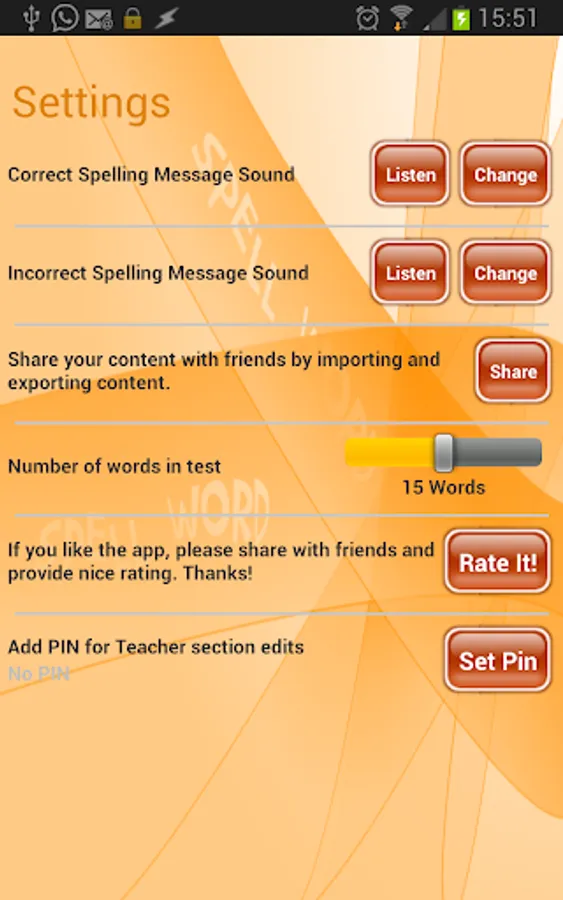 2. Change settings on the settings page, increase/decrease test size, change sound for correct and incorrect words.