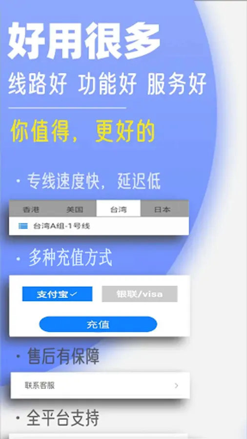 Intelligent shunt technology, smooth Internet experience, perfect support for games and various software websites, exclusive broadband, international backbone broadband nodes, no delay and smoother!