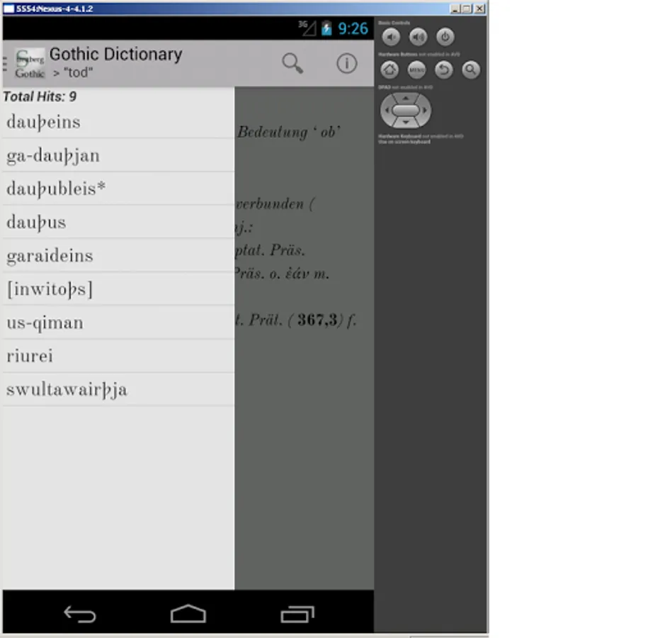 This is an offline digital version of Streitberg's Gotisch-griechisch-deutsches Wörterbuch (1910). Some of the entries have been abridged from the original, especially Greek glosses, since the emphasis is the Gothic language. The text is fully searchable and, unlike in the original printing, each entry head-word is given in both transliteration and in the original Gothic script.