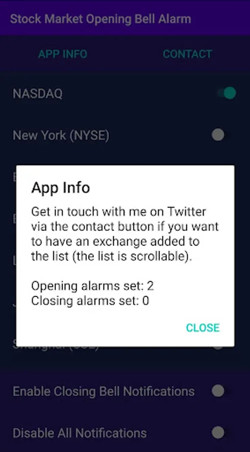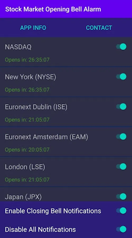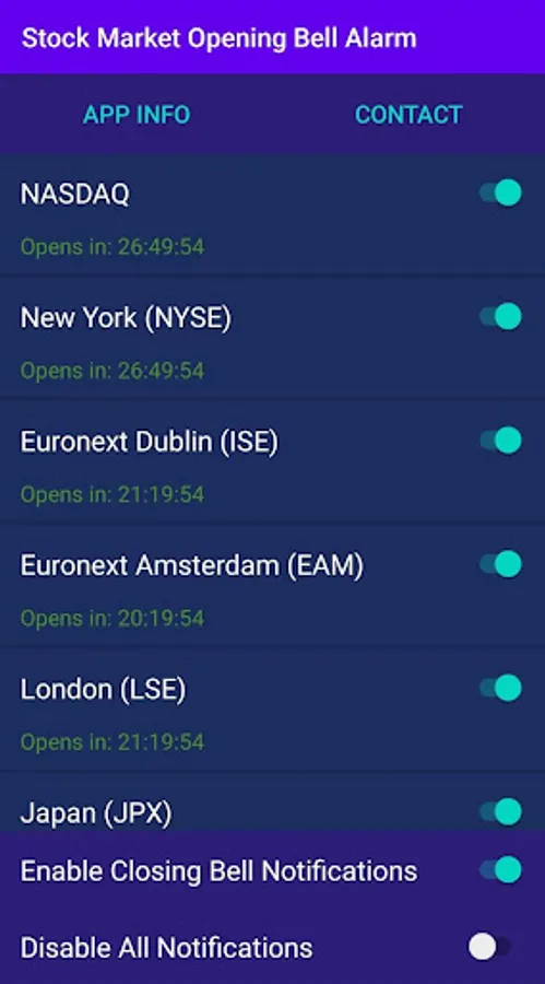 Receive notifications when stock exchanges open, and close with the Stock Market Opening Bell Alarm app.