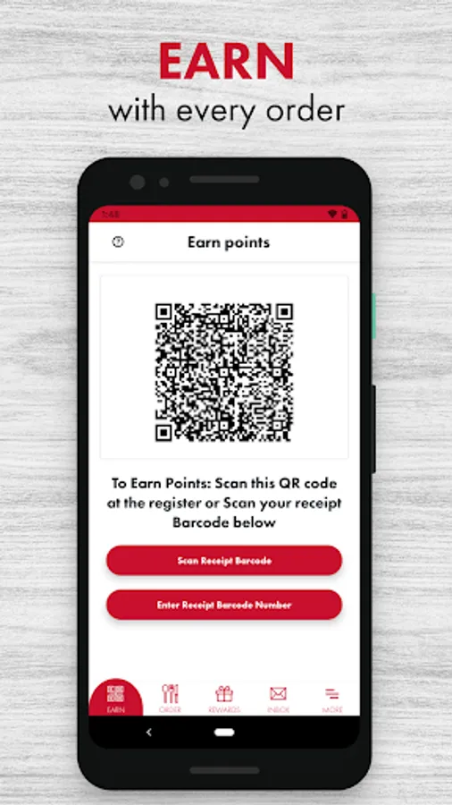 Order in-store: Scan your App QR code at the register each time you order or Scan thebarcode at the bottom of your receipt after ordering.