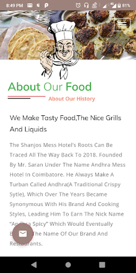 The Shanjos Mess Hotel’s roots can be traced all the way back to 2018. Founded by Mr. Saran under the name Andhra mess Hotel in Coimbatore. He always make a turban called Andhra(a traditional crispy sytle), which over the years became synonymous with his brand and cooking styles, leading him to earn the nick name “Andhra Spicy” which would eventually became the name of our brand and restaurants.