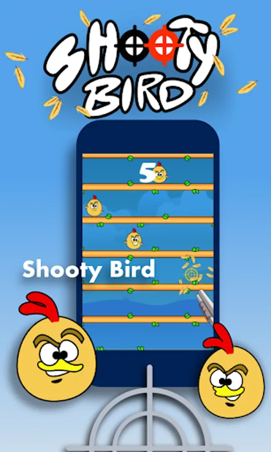 It is very challenging game, simple game and fun game to play shooting. This Game seems very simple but difficult to play, But the one who can make it can play flawlessly and Shoot the birds. Definitely, When you show this game first time to your friend they will be amazed that you are able to play and they are stuck to 2 & 3 (Score). Challenge your friend and Chase your high-score. Shoot all the freak bird and have Fun Because this is Our "Shooty Bird".