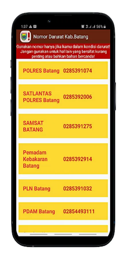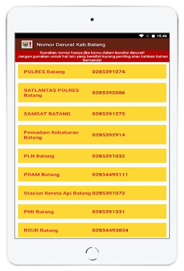 The Batang Regency emergency number application is a media provider of emergency installation number services that are within the scope of Batang Regency. All services in the application can be used immediately and will directly contact the relevant installation. So, it is expected to use it wisely according to the situation and conditions as well as the norms that apply in society.