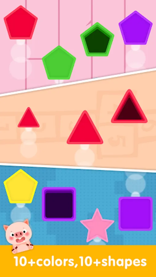 The main skill given to the app is differentiating shapes. It includes simple shapes such as squares, triangles and circles as well as other shapes such as polygons, rhombuses. Matching is done through different combinations of colors and shapes to help your baby recognize basic shapes and colors